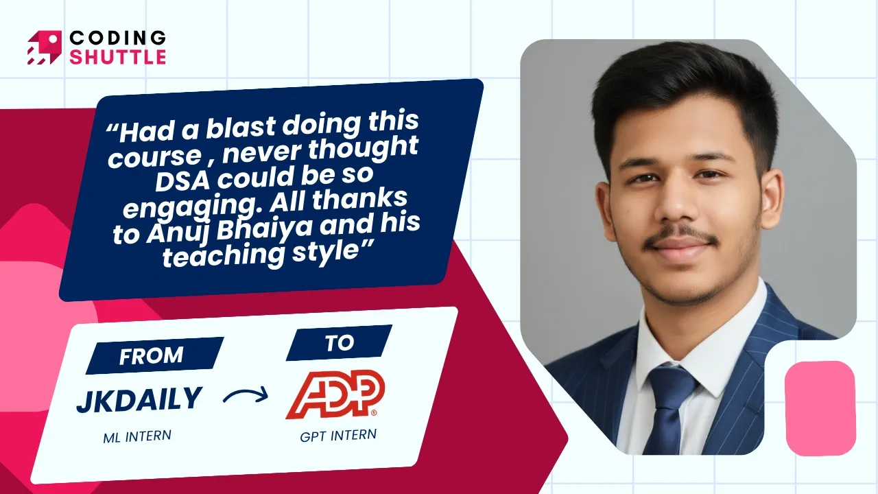 Abhinav Sharma was working as an ML Intern at JKDaily when he enrolled in Coding Shuttle's DSA Course. He was not running away from machine learning. He was building toward something broader, a technical foundation strong enough to compete for roles at companies like ADP, one of the world's largest HR and payroll technology platforms.