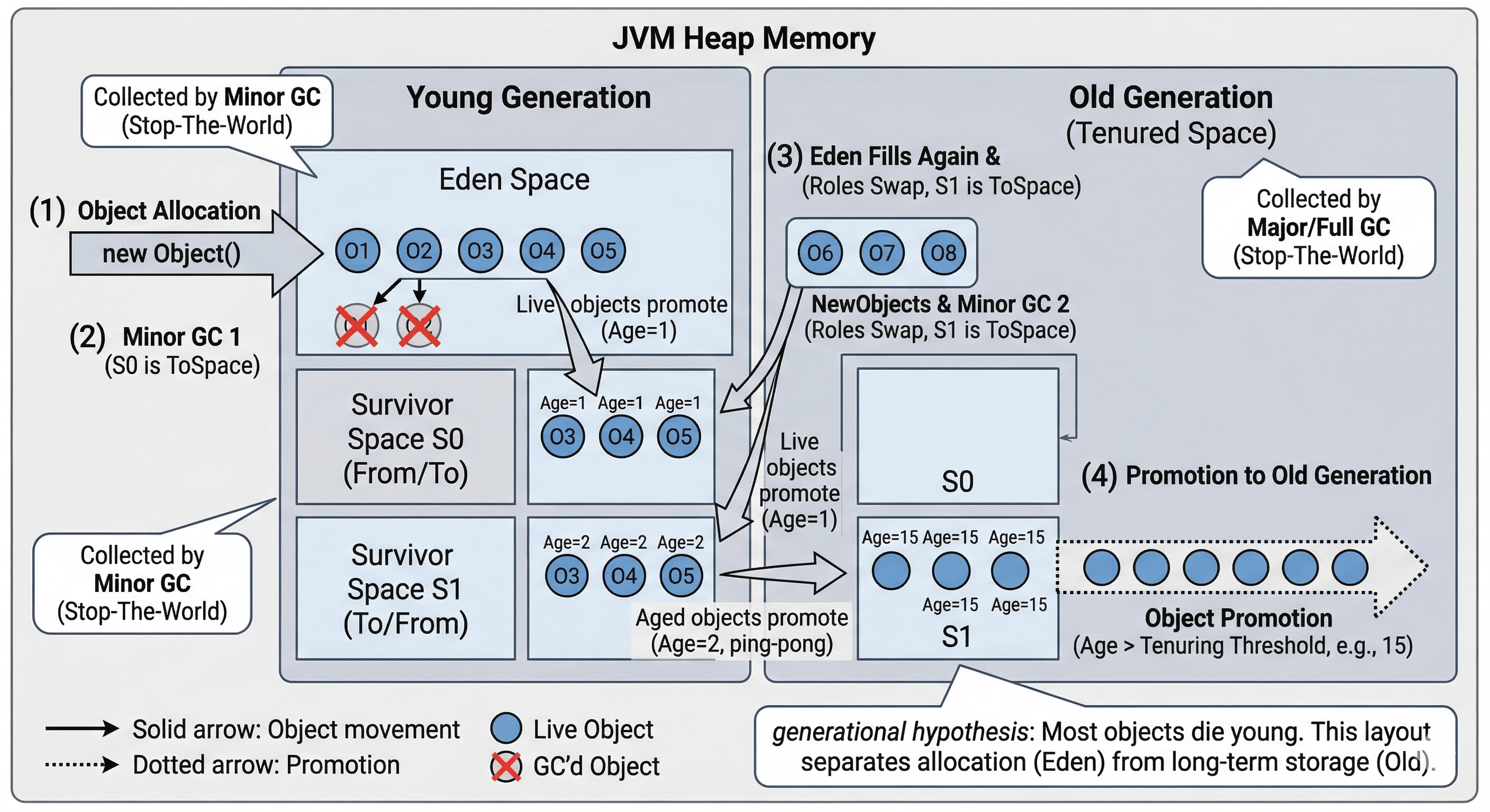 - Young Generation: Where new objects are allocated. GC here (Minor GC) is fast and frequent.