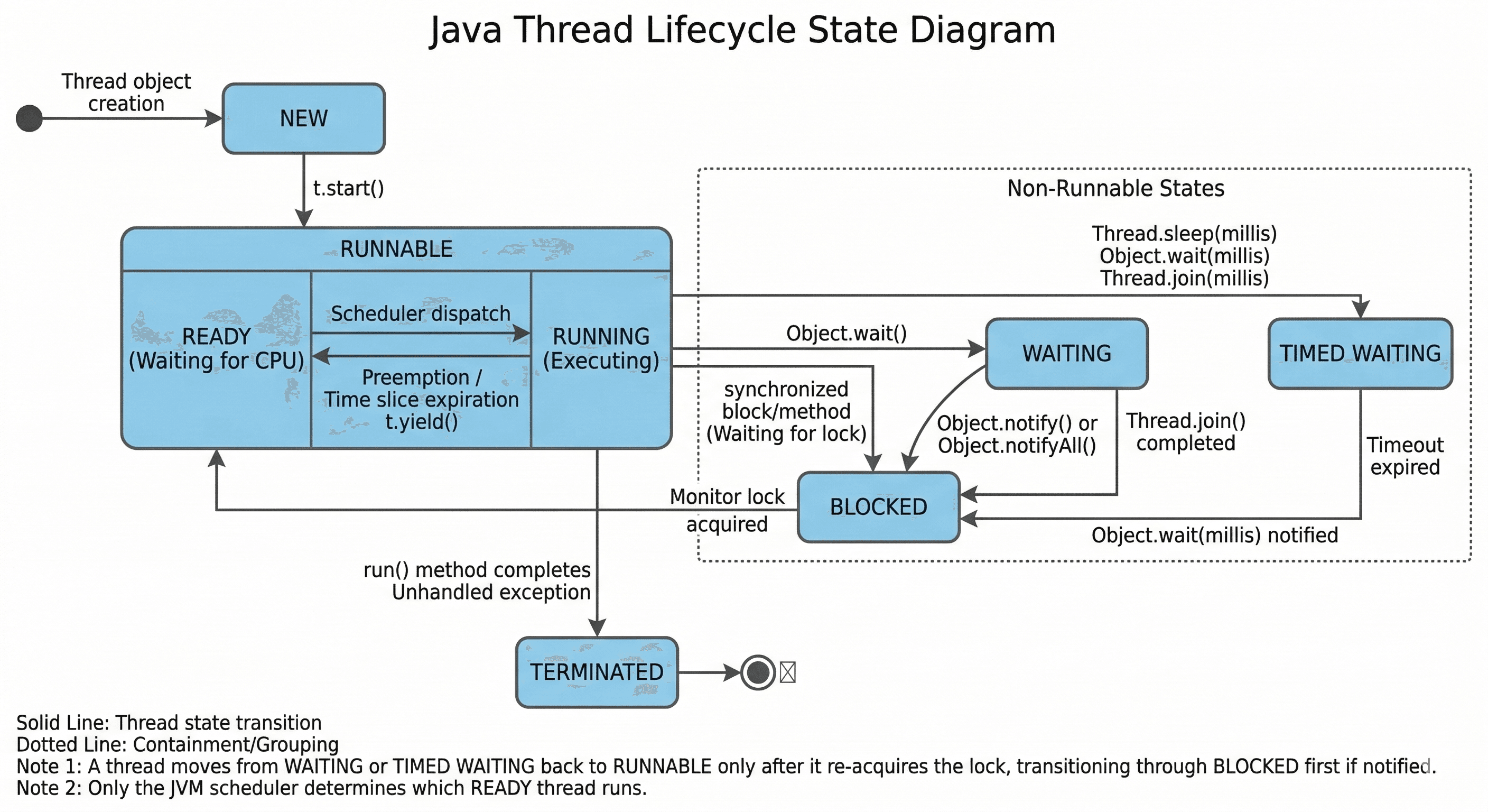 start(), the thread is ready to run and waiting for CPU time. - Blocked/Waiting: The thread is alive but not eligible to run. It is waiting for a monitor lock (blocked) or for another thread to perform an action (waiting).