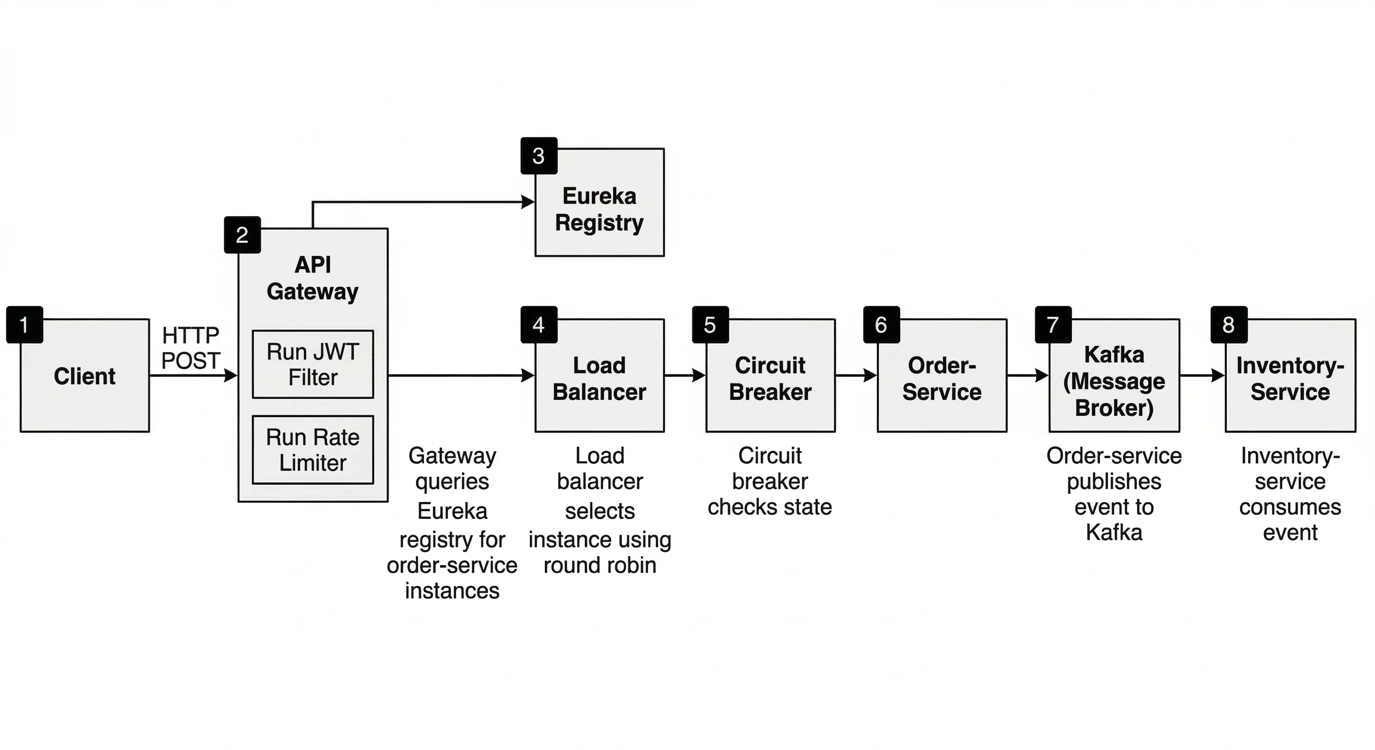 This section traces one user request — placing an order — through every layer of a production Spring Cloud system.