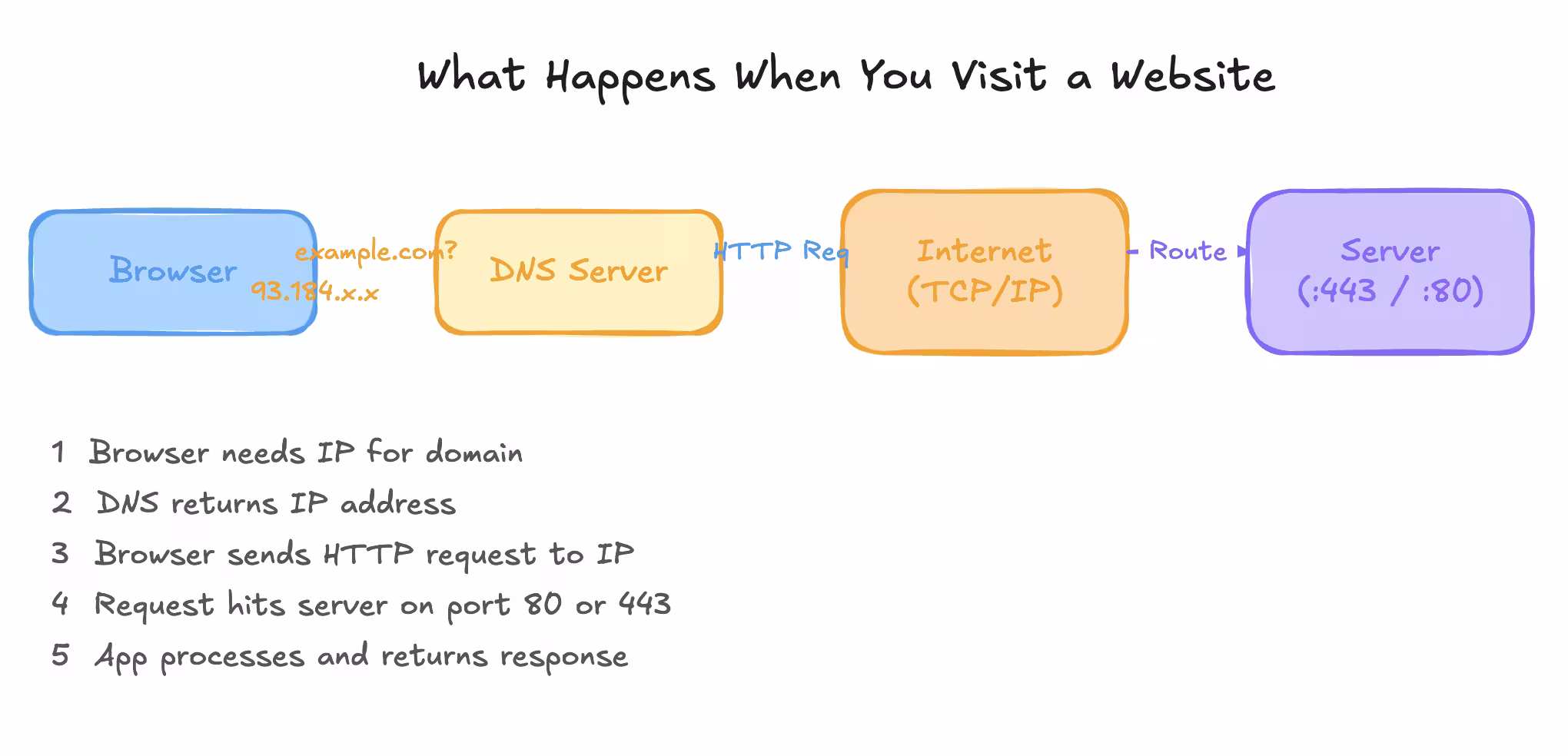 example.comto an IP address - Your browser sends a request to that IP